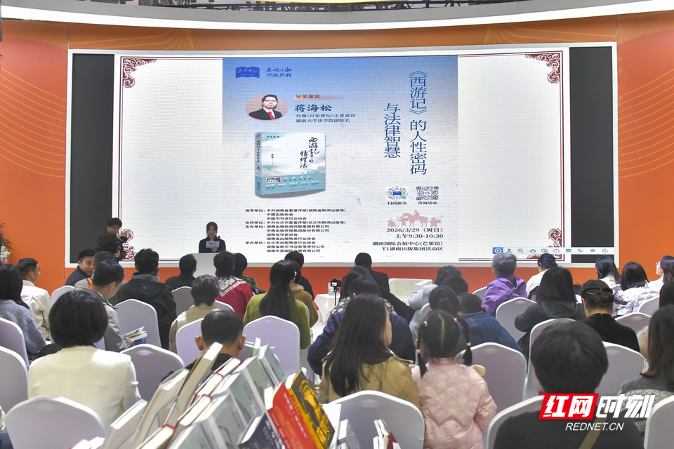 3月29日上午,湖南大学法学院副院长蒋海松莅临湖南国际会展中心湖南出版集团展区,带来“《西游记》的人性密码与法律智慧”主题分享。