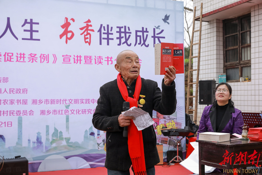“书香寿诞”读书分享会上,谭立人结合《全民阅读促进条例》,真诚呼吁乡亲们养成读书习惯。