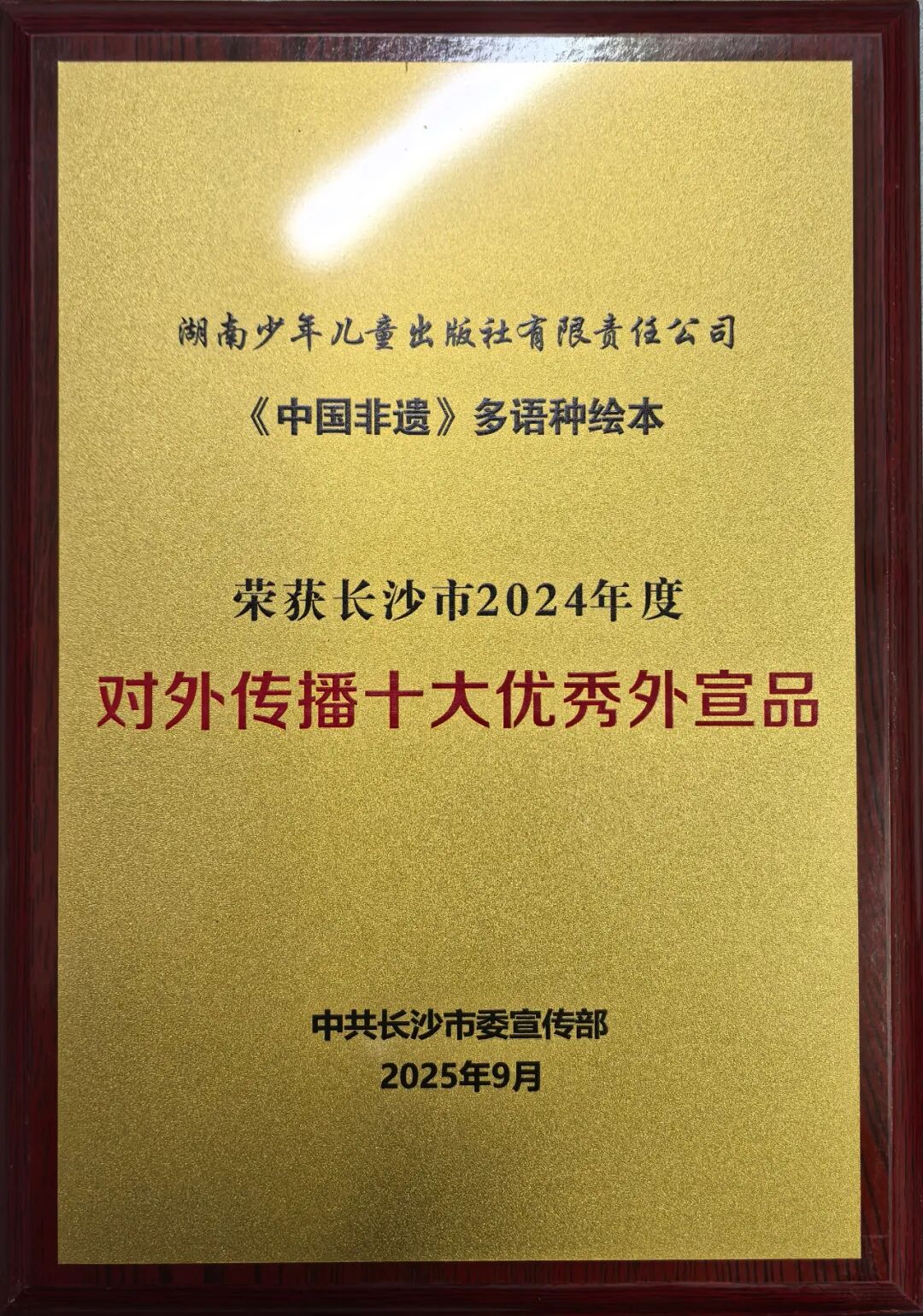 近日,长沙市2024年度优秀文化外宣品及对外传播“十大优秀案例”征集评选结果公布。湖南少年儿童出版社的《中国非遗》多语种绘本作为唯一一种出版物入选长沙市2024年度对外传播十大优秀外宣品。