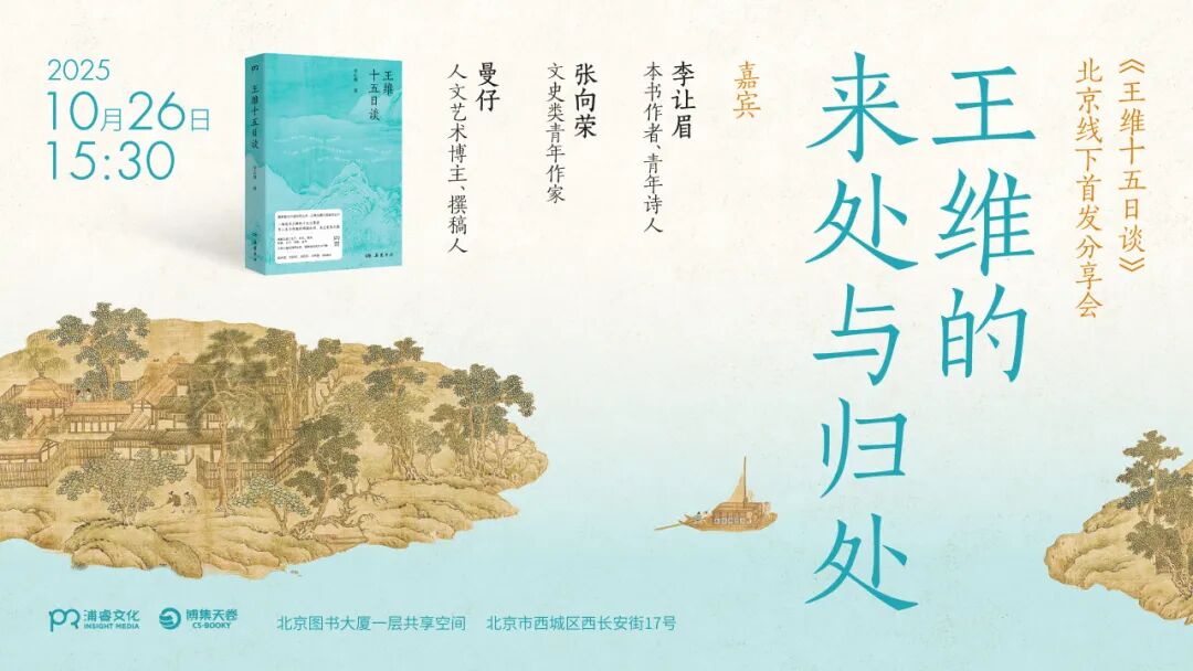 10月26日下午15:30,青年诗人、作家李让眉将携新书《王维十五日谈》,与文史类青年作家张向荣、人文艺术博主,撰稿人曼仔,共同做客北京图书大厦,以诗人之眼关照王维诗独特的妙处,用十五篇漫谈追寻王维,还原王维的人生境遇与精神世界。