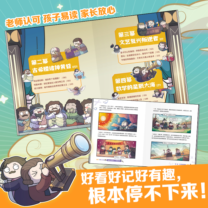 这种“故事+漫画+知识”的模式,彻底打破了传统数学教学的刻板印象,让孩子明白:数学不是用来“刷题”的工具,而是用来探索世界的钥匙。当孩子从数学故事里感受到乐趣,从科学家身上看到坚持,他们自然就会放下对数学的恐惧,主动去亲近这门学科。