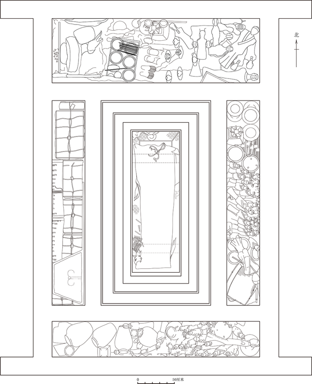 手绘马王堆一号墓木椁出土情形分层线描图。