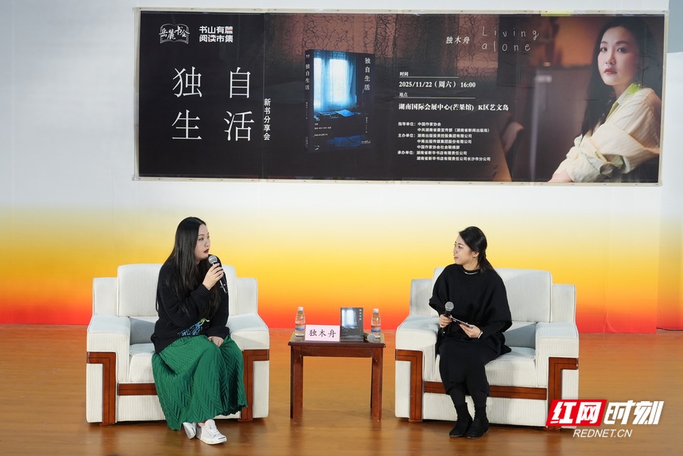 红网时刻新闻11月22日讯(记者 汪衡 摄影 龚子杰)11月22日下午,作家独木舟(葛婉仪)携其新书——散文集《独自生活》亮相2025中国文学盛典·湖南文学周暨第四届岳麓书会,在“书山有麓·阅读市集”艺文岛现场将她独特的生活体验,淬炼成一场关于当代都市青年自我构建与精神独立的公共讨论。