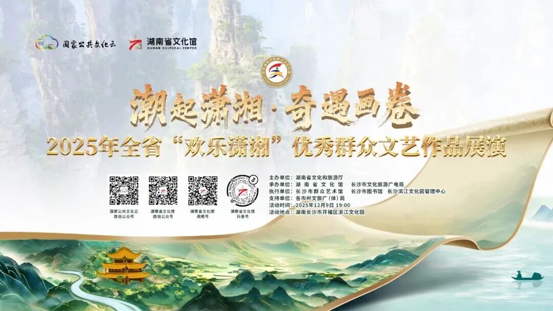 12月9日19:00,“潮起潇湘·奇遇画卷”2025湖南省“欢乐潇湘”群众文化活动将在湖南省长沙市开福区滨江文化园举办。