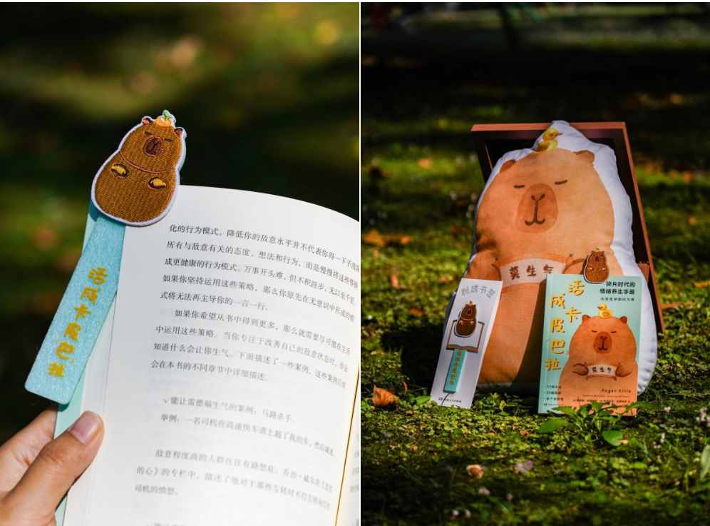 书签一直是出版社文创产品绕不过的选品,团队想尝试制作一个更适合秋天、更引人注目的书签。基于社内已出版书籍的选题和品牌特色,我们从数十个图案中甄选两款,以传统刺绣工艺赋予其生命力:“人民万岁”承载厚重家国情怀,针脚细密处尽显庄重;“活成卡皮巴拉”传递松弛治愈感,绒线勾勒出软萌模样。